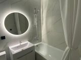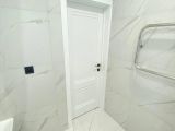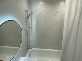 В ванной комнате на стены уложен широкоформатный керамогранит.
